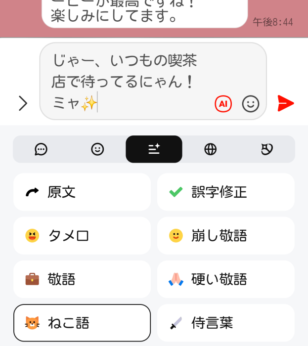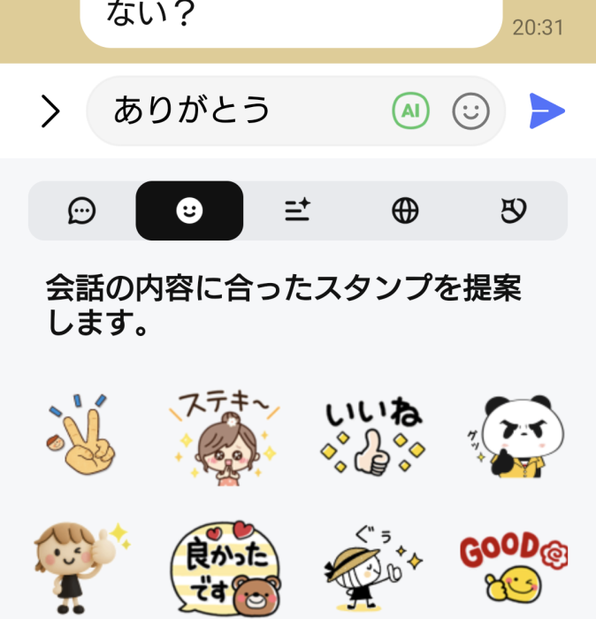 AIが「😊」「💕」のスタンプをおすすめしてくれます。